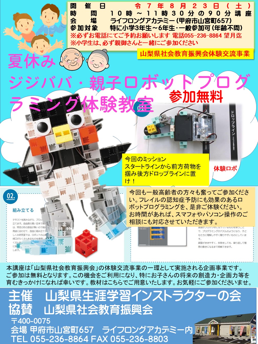 夏休み親子ロボットプログラミング体験講座の開催予定です